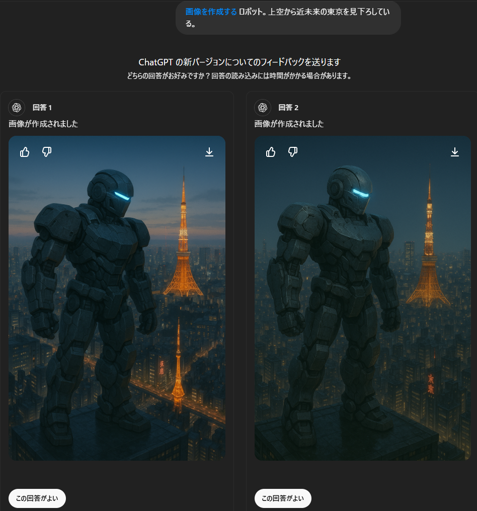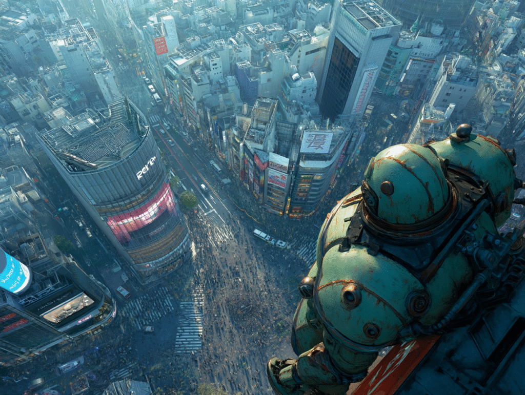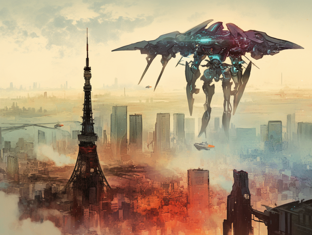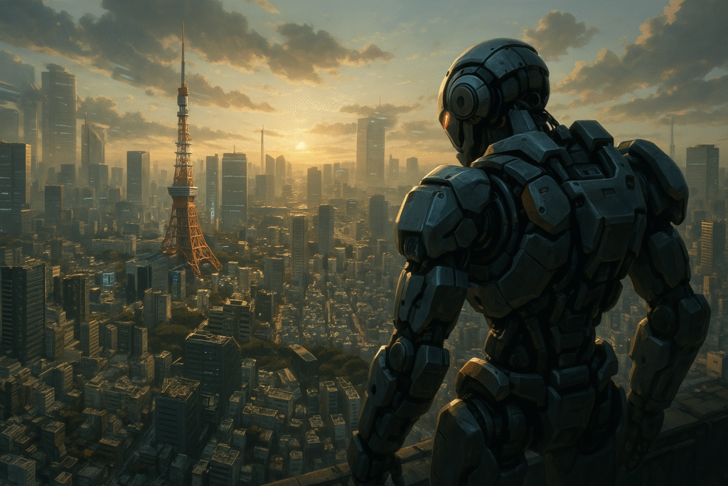 画像を生成する ロボット。上空から近未来の東京を見下ろしている。